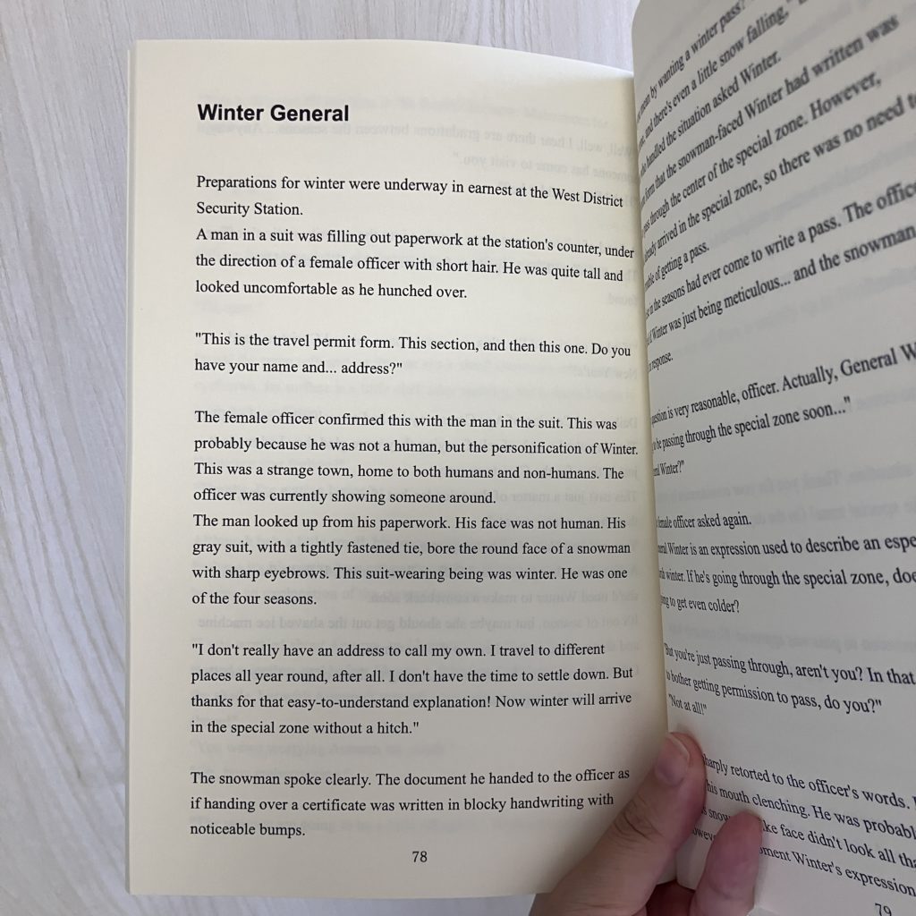 今回は文字数を12ptにしました。普段はA5サイズで8.5ptなのでかなり大きめです。ちょっと児童向けにも読める作品なので、子供でも読みやすそうな文字サイズにしたかったのもあります。